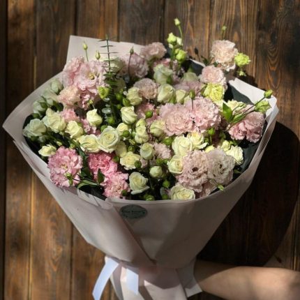 Лавандовый раф с сиренью,пион розами,маттиолой,диантусами и эустомой