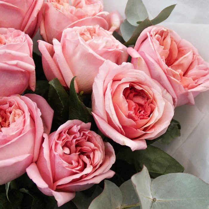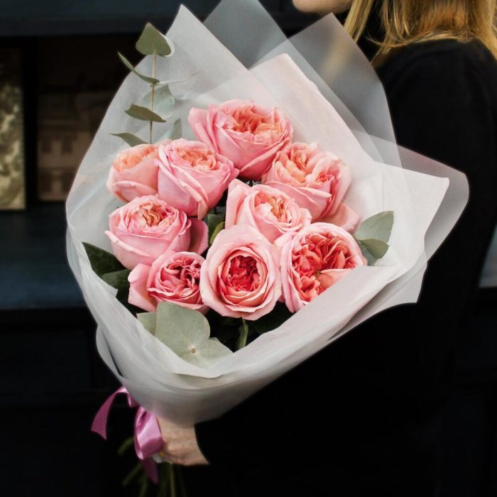 Эвкалипт – 2 шт.Тишью – 1 шт.Атласная лента – 2 шт.Матовая пленка – 1 шт.пионовидные розы – 9 шт.