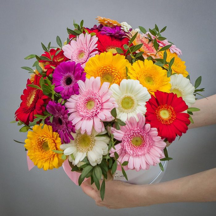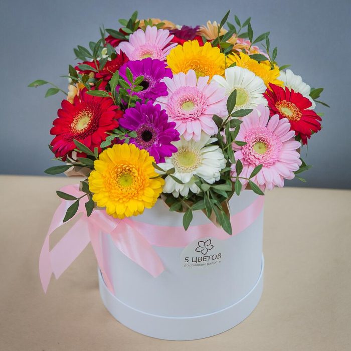 Гербера желтая – 5 шт.Гербера красная – 5 шт.Гербера розовая – 5 шт.Гербера белая – 5 шт.Гербера кремовая – 3 шт.Гербера фиолетовая – 2 шт.
