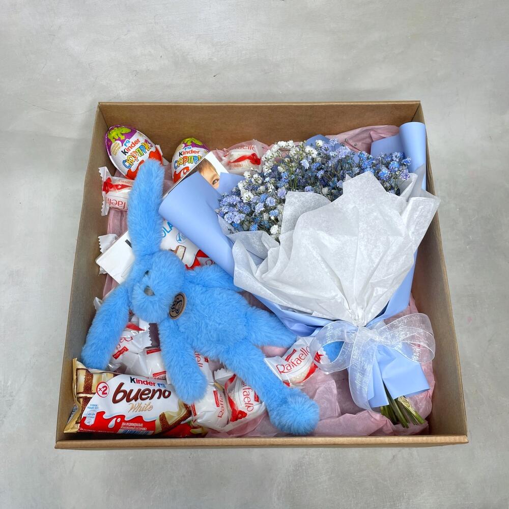 Гипсофила – 3 шт.Упаковка – 1 шт.Kinder bueno – 1 шт.Kinder сюрприз – 2 шт.Kinder chocolate – 1 шт.Raffaello конфеты – 10 шт.коробка крафт с окошком – 1 шт.игрушка зайчонок lapkin – 1 шт.