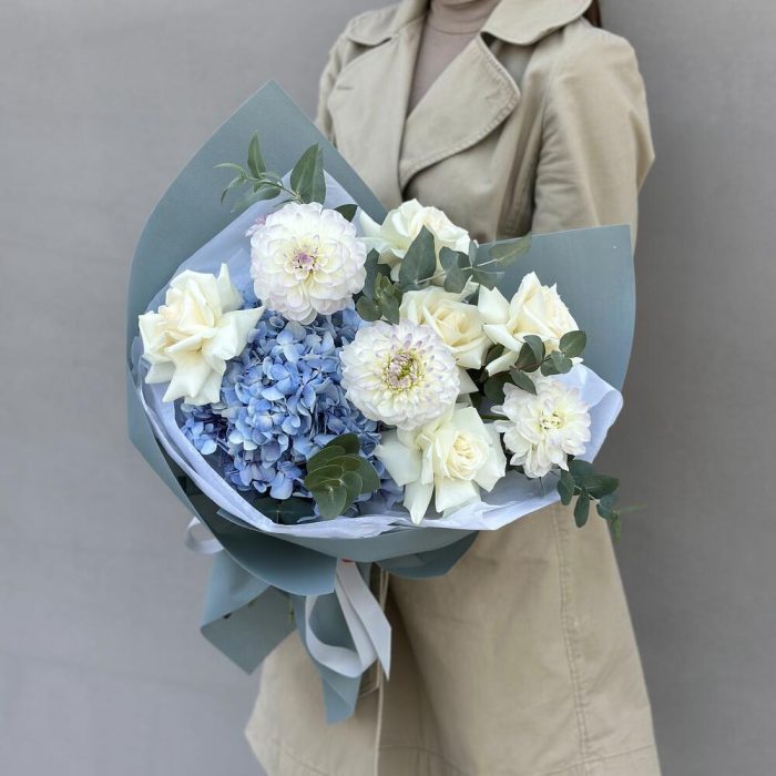 розы – 5 шт. георгины – 3 шт. Гортензия – 1 шт. Эвкалипт – 2 шт.