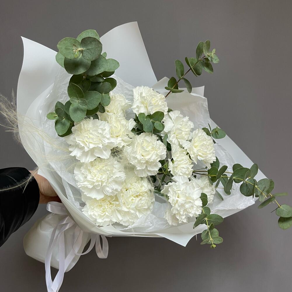 Эвкалипт – 3 шт.Гвоздика сортовая – 13 шт.Упаковка дизайнерская – 1 шт.ковыль сухоцвет – 1 шт.