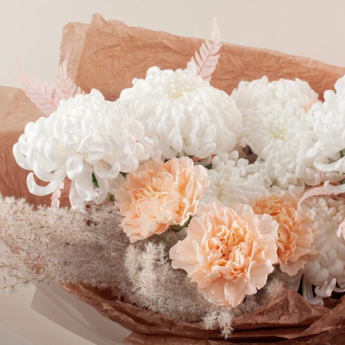 Гвоздика – 5 шт. Хризантема одноголовая – 6 шт. лист папоротника – 1 шт. Оформление – 1 шт.