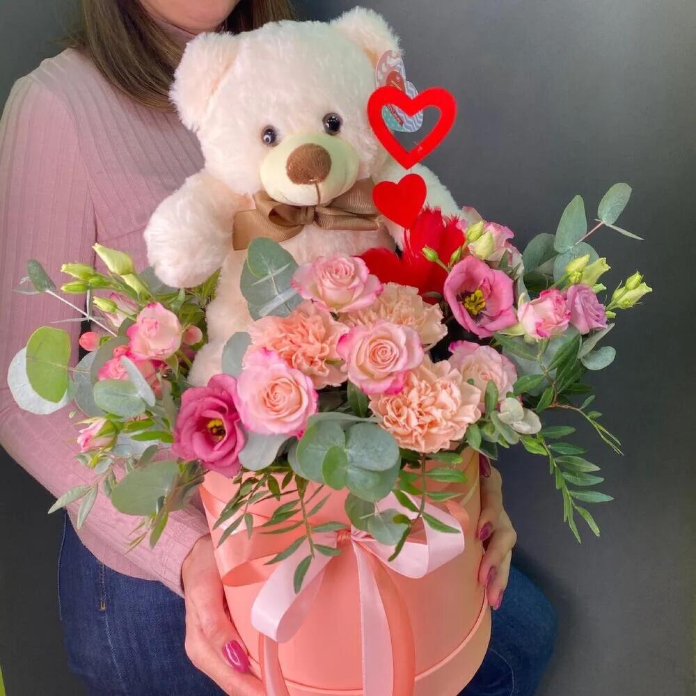 Альстромерия – 1 шт.Гиперикум – 1 шт.Лизиантус – 1 шт.Роза кустовая – 2 шт.Эвкалипт – 3 шт.Диантус – 3 шт.Плюшевый медведь – 1 шт.Шляпная коробка большая vip – 1 шт.