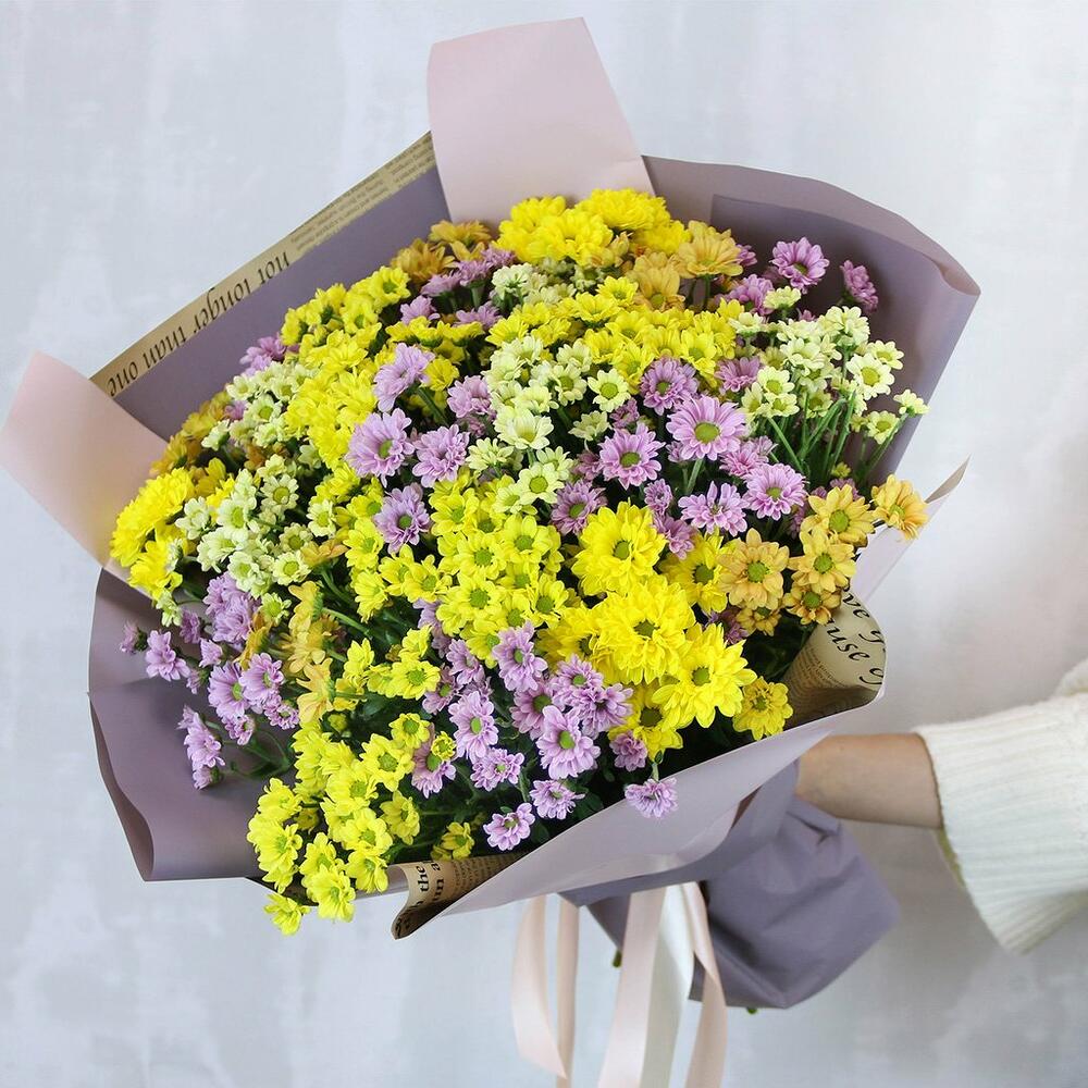 Букет из 25 кустовых хризантем Сантини микс в стильной упаковке