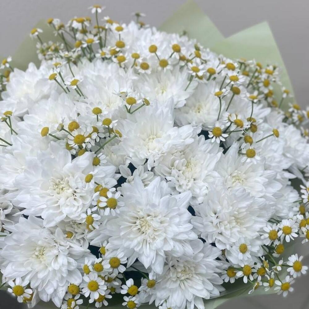 Хризантема кустовая – 6 шт.Танацетум – 7 шт.Упаковка дизайнерская – 1 шт.Лента атласная – 1 шт.
