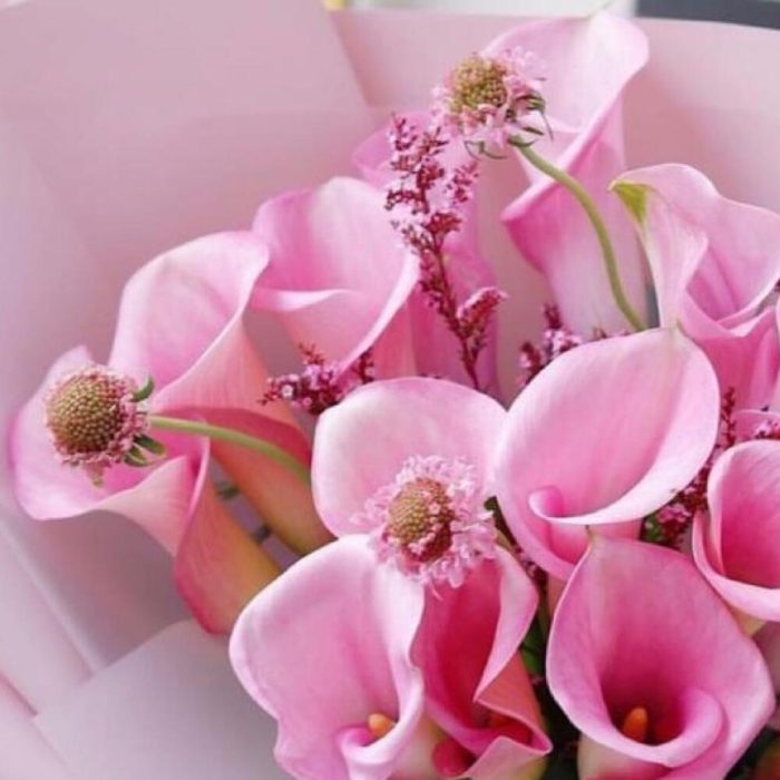 Калла розовая – 13 шт.декоративная зелень – 10 шт.Упаковка дизайнерская – 2 шт.Лента атласная – 2 шт.Открыточка с вашими пожеланиями – 1 шт.хорошее настроение – 100 шт.инструкция по уходу за цветами – 1 шт.коробка переноска – 1 шт.Кризал – 1 шт.