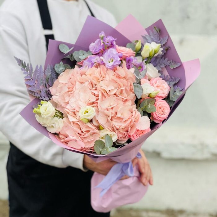 Гортензия – 1 шт.Маттиола – 1 шт.Папоротник – 2 шт.Эвкалипт – 5 шт.Эустома – 2 шт.Лента атласная – 1 шт.Упаковка дизайнерская – 5 шт.Бомбастик – 3 шт.
