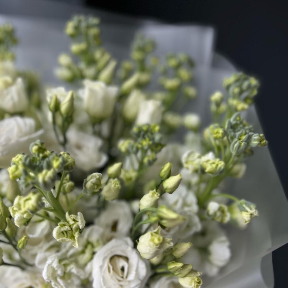 Маттиола – 10 шт.Лизиантус – 9 шт.декоративная упаковка – 1 шт.Атласная лента – 1 шт.