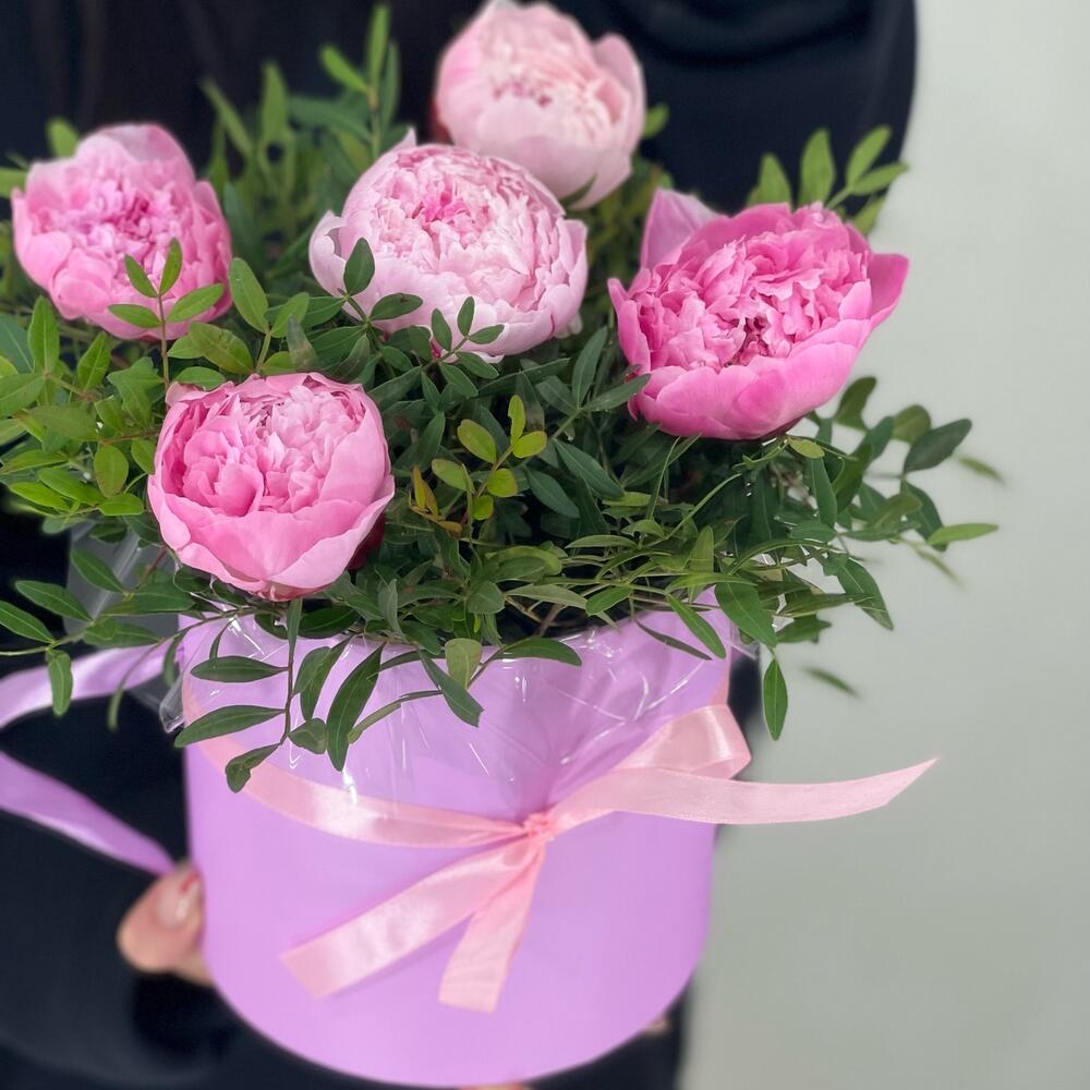Фисташка – 5 шт.Пион Сара Бернар – 5 шт.коробочка с оазисом и лентами – 1 шт.