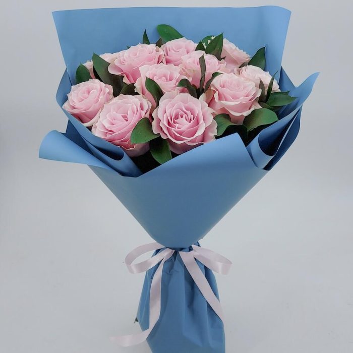 11 нежно-розовых роз с зеленью