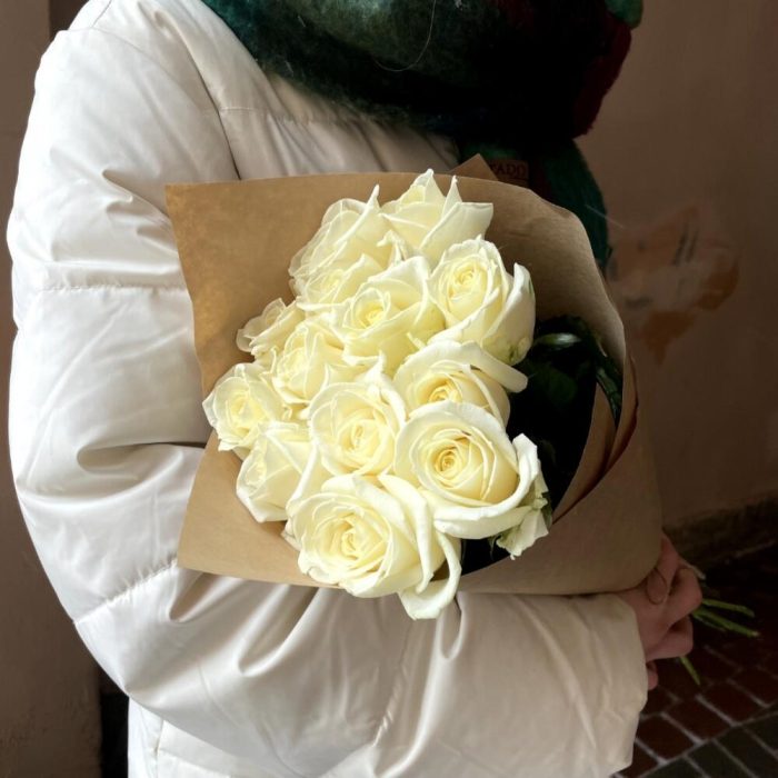 Крафт упаковка – 1 шт.Роза россия белая – 13 шт.