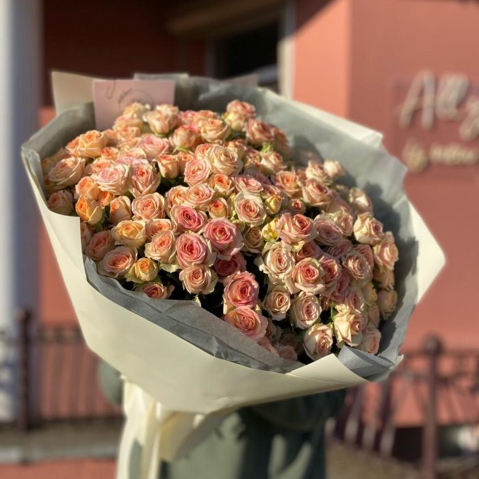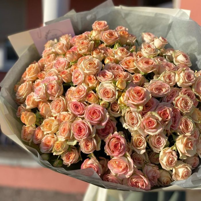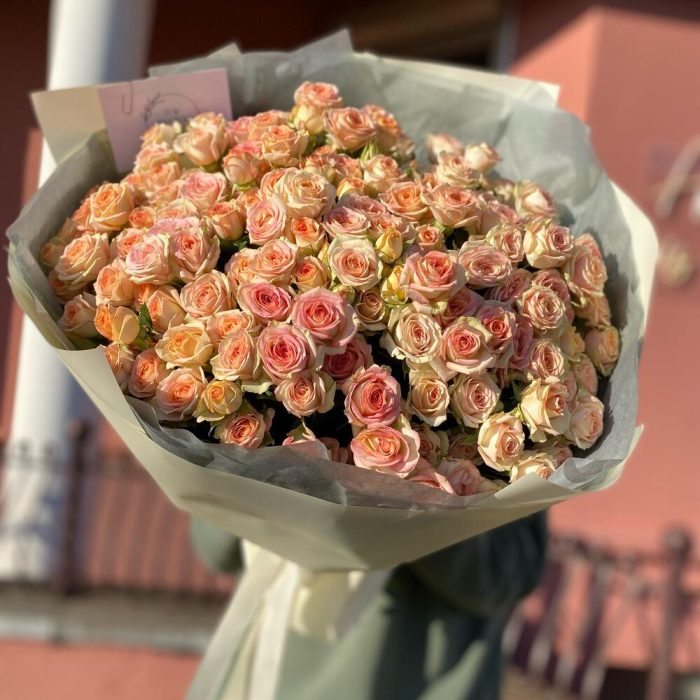 Кустовая роза – 25 шт. Тишью – 1 шт. Дизайнерская упаковка – 1 шт.