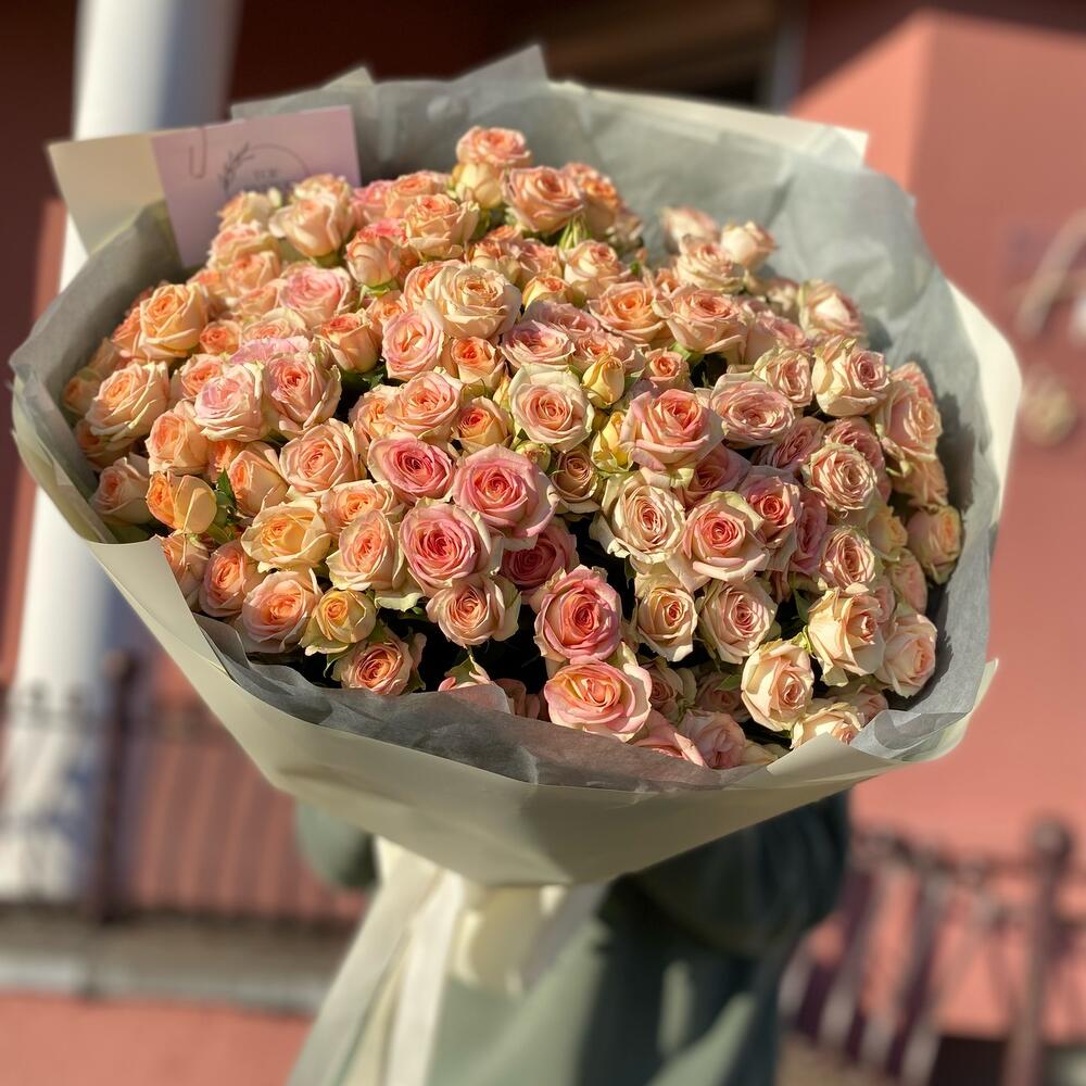 Букет из 25 кустовых веток сорта Azor с дизайнерским оформлением. Количество розочек (бутонов ) в букете может достигать 171 штуки