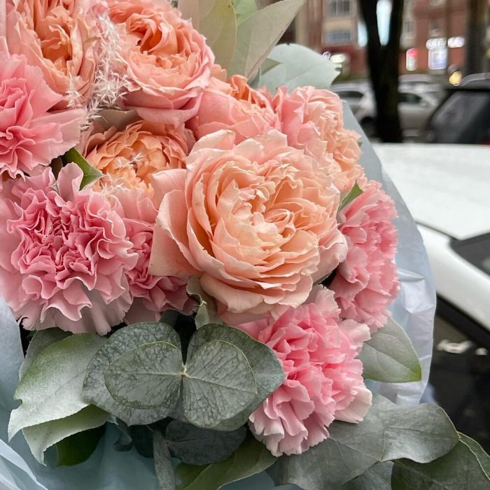 Салал – 5 шт.Тишью – 2 шт.Гвоздика сортовая – 7 шт.Пленка матовая – 2 шт.джульетта роза пионовидная – 3 шт.сухоцветы декоративные микс – 2 шт.эакплипт – 1 шт.