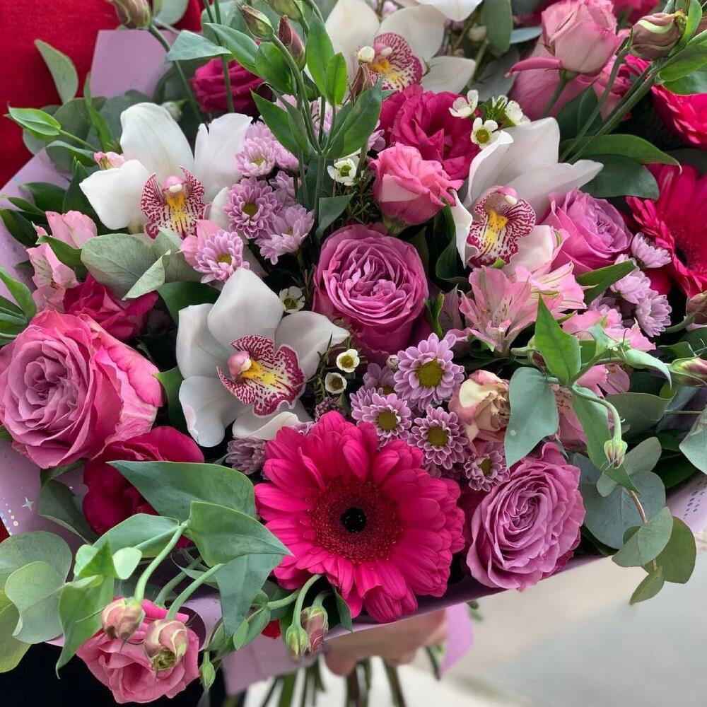 Хризантема Сантини – 4 шт.Альстромерия – 2 шт.Орхидея Цимбидиум – 5 шт.Гербера – 3 шт.Роза пионовидная – 5 шт.Лизиантус – 3 шт.Ваксфлауэр – 2 шт.Эвкалипт – 1 шт.Рускус – 25 шт.Упаковка дизайнерская – 2 шт.Лента атласная – 1 шт.