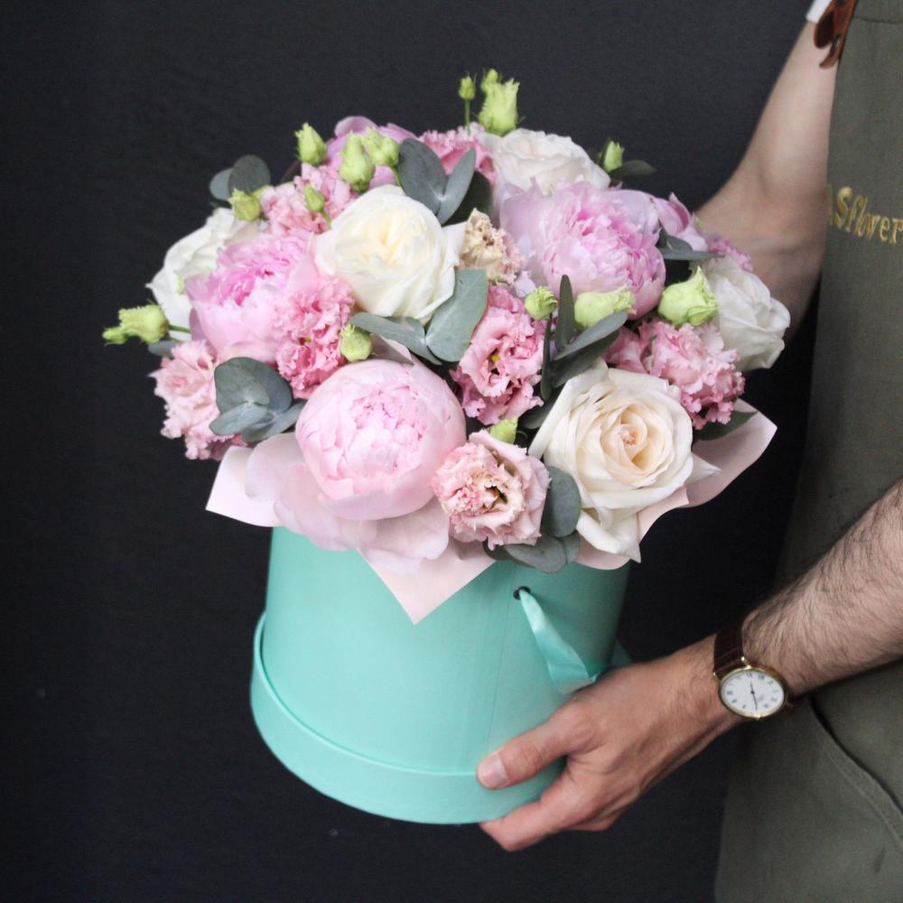 Эвкалипт – 3 шт.Эустома – 3 шт.Коробка шляпная – 1 шт.Роза пионовидная – 5 шт.Пион Сара Бернар – 7 шт.Логотип – 1 шт.Пленка матовая – 1 шт.Оазис флористический – 1 шт.