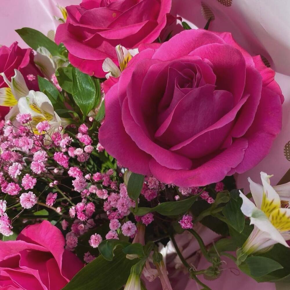 Роза Эквадор – 5 шт.Альстромерия – 3 шт.Гипсофила – 1 шт.Пистация – 3 шт.Корейская пленка – 1 шт.Лента – 1 шт.