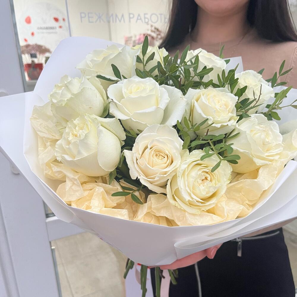 Роза белая эквадор 50 см – 11 шт.зелень фисташка – 5 шт.Упаковка – 1 шт.