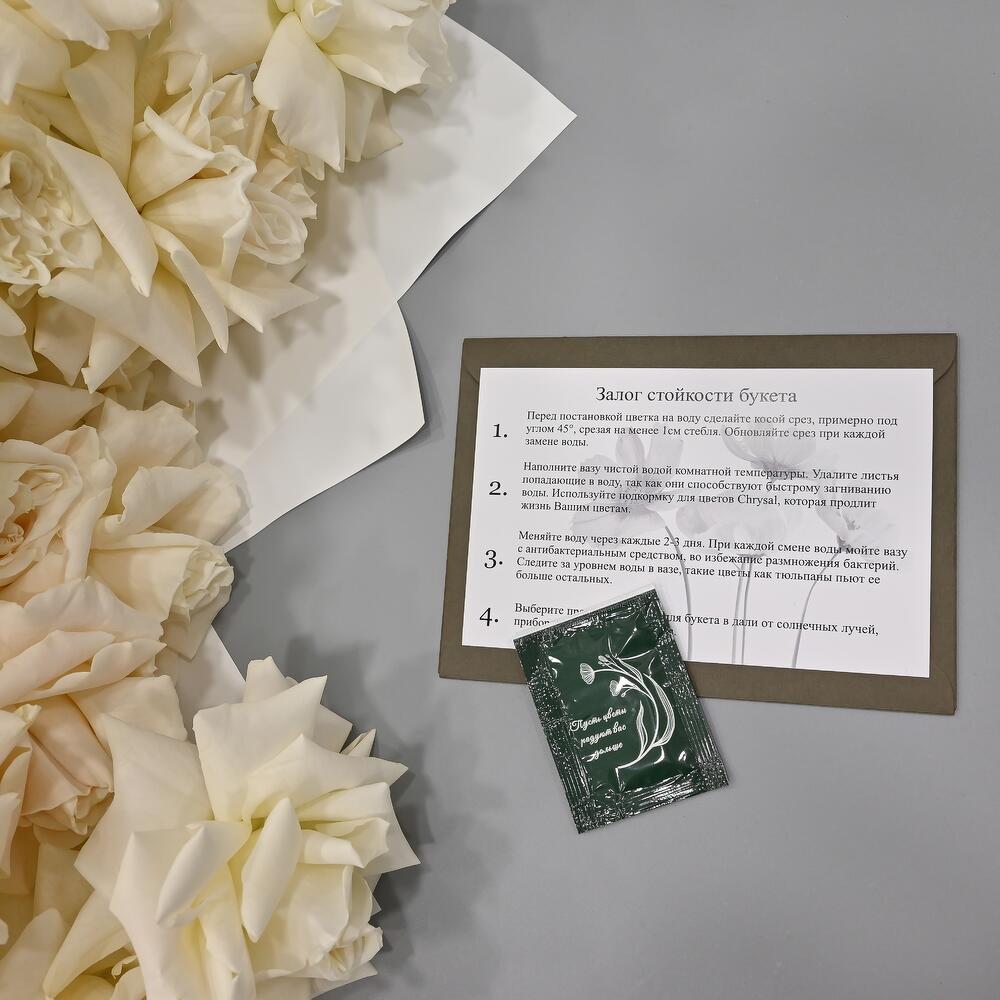 - Сроки возврата: Претензии по качеству букета принимаются в течение 24 часов с момента его получения.
