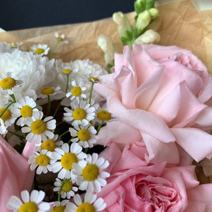 Букет из пионовидных роз, ромашки и антиринум «любовь»