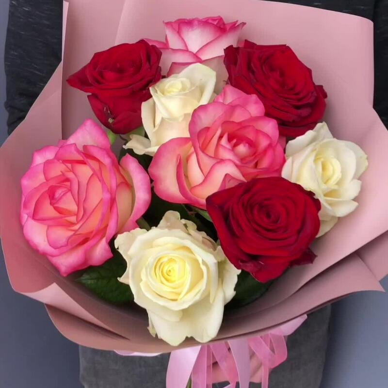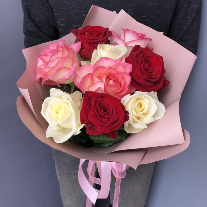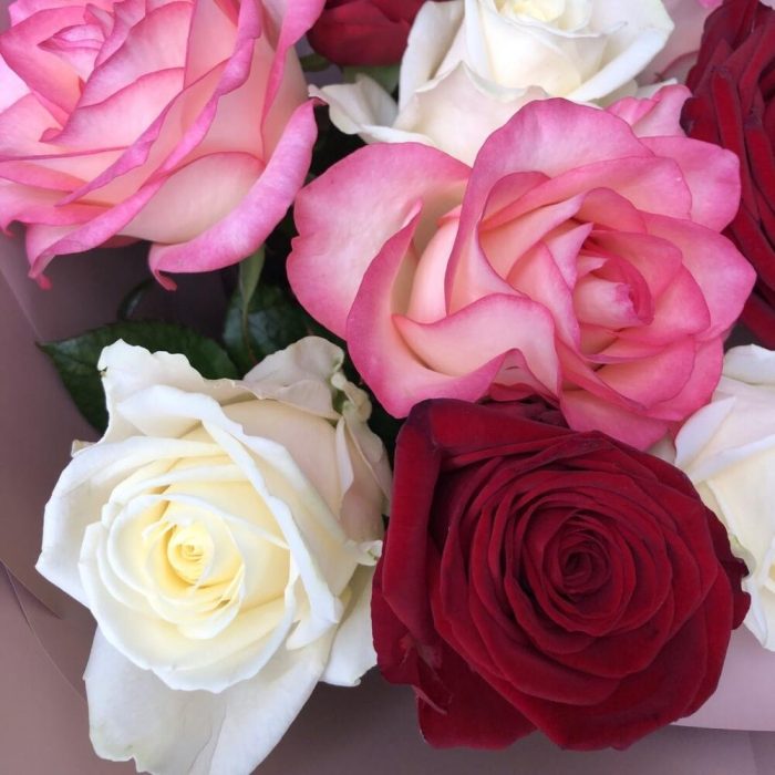Лента атласная – 1 шт.Пленка матовая – 1 шт.розы сорта red naomi – 3 шт.роза сорта аваланж – 3 шт.роза сорта джумилия – 3 шт.