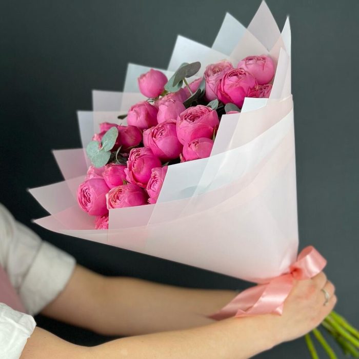 Эвкалипт – 5 шт.Лента атласная – 1 шт.Роза кустовая пионовидная – 7 шт.бумага дизайнерская – 5 шт.