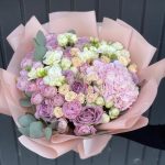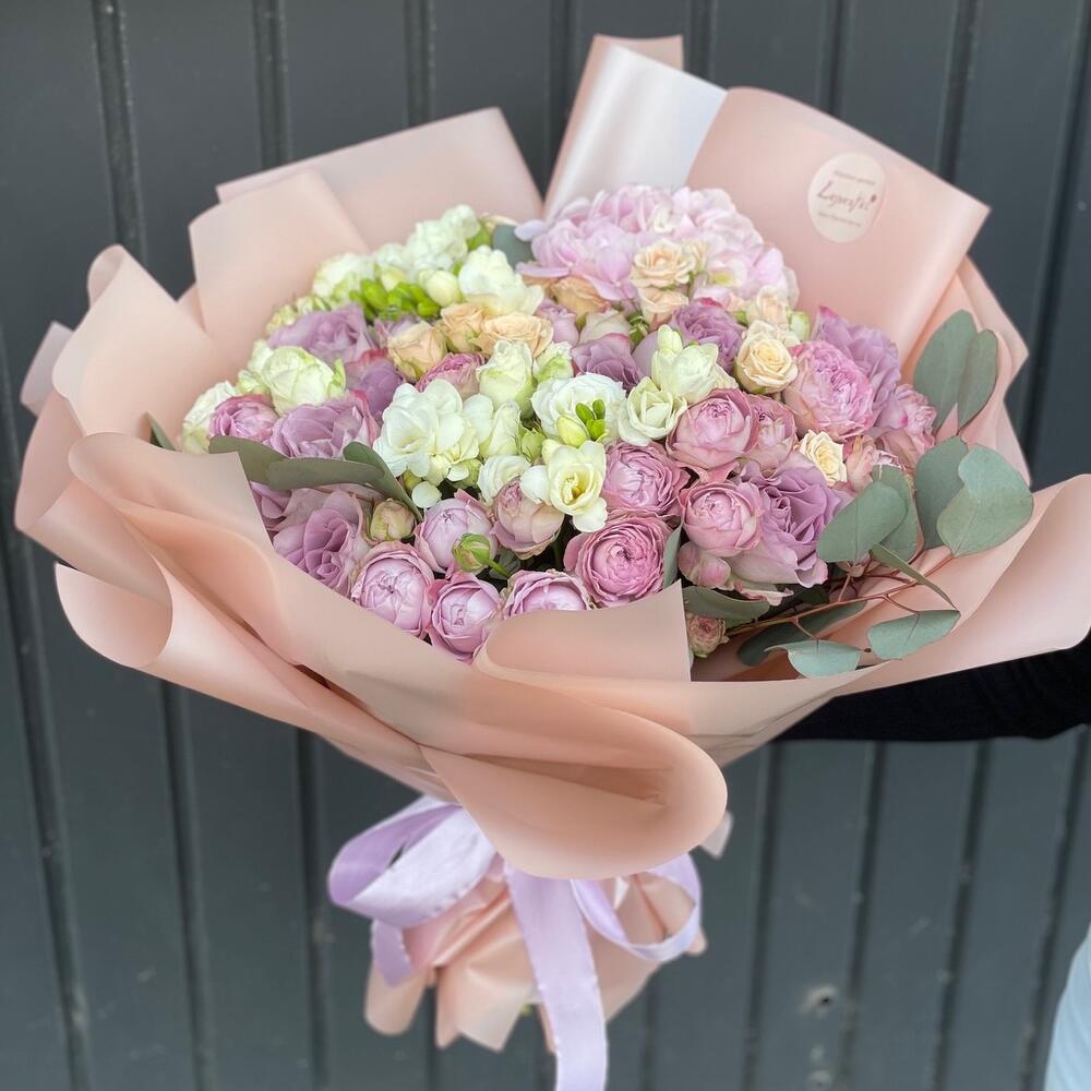 Альстромерии, Гвоздики, Кустовые розы, Лизиантусы, Розы, Хризантемы