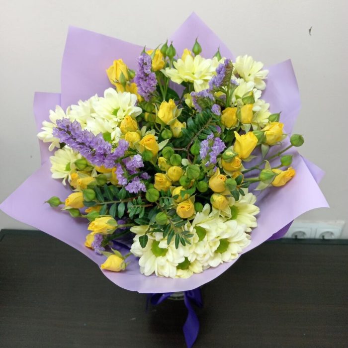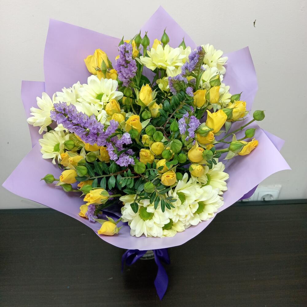 Хризантема кустовая – 3 шт.Роза кустовая – 9 шт.Лимониум – 2 шт.Зелень – 3 шт.Упаковка – 1 шт.
