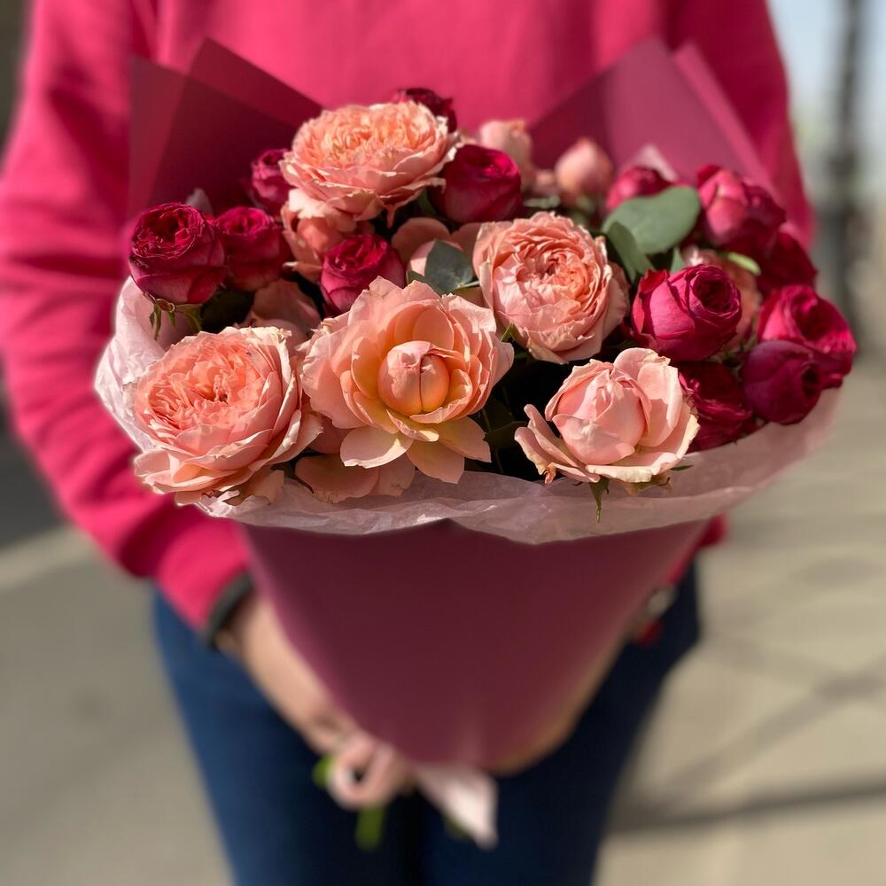 Букет пионовидных роз с эвкалиптом