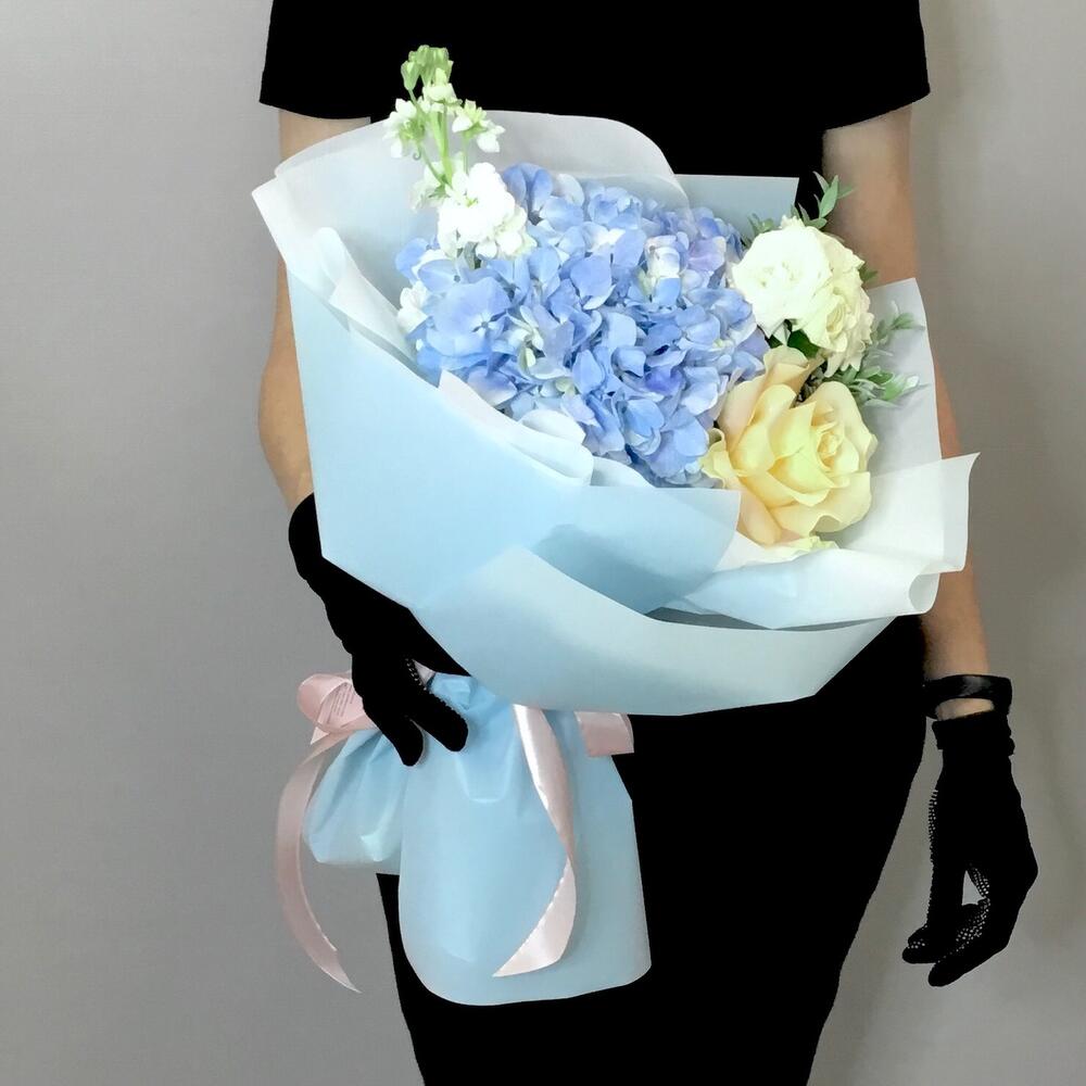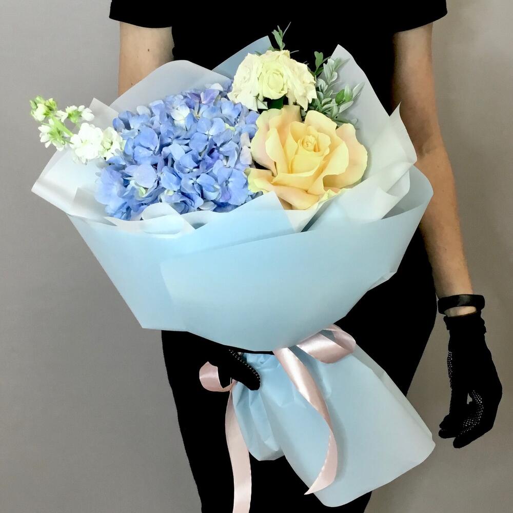 Маттиола – 1 шт.Кустовая роза – 1 шт.Лента атласная – 1 шт.Фисташка – 2 шт.Гортензия голубая – 1 шт.роза шарман – 1 шт.