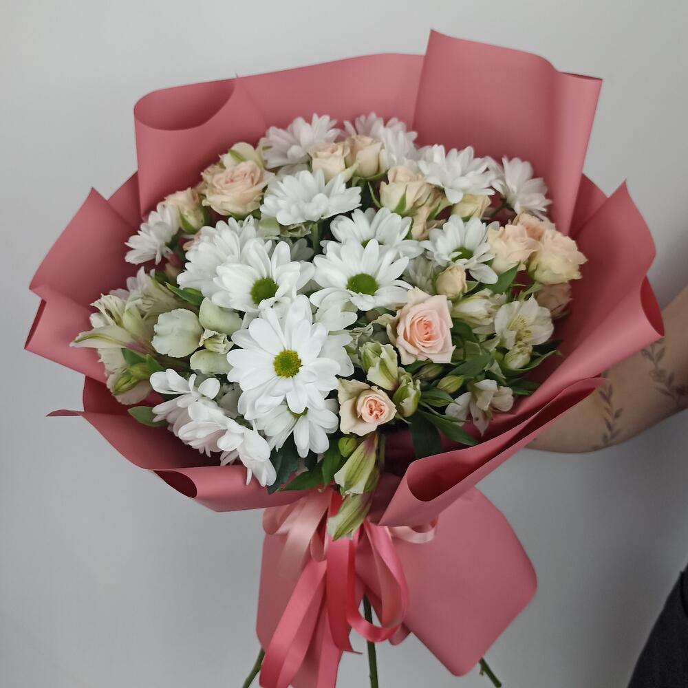 Альстромерия – 4 шт.Лента – 2 шт.Роза кустовая – 5 шт.Хризантема кустовая – 5 шт.Пленка матовая – 2 шт.