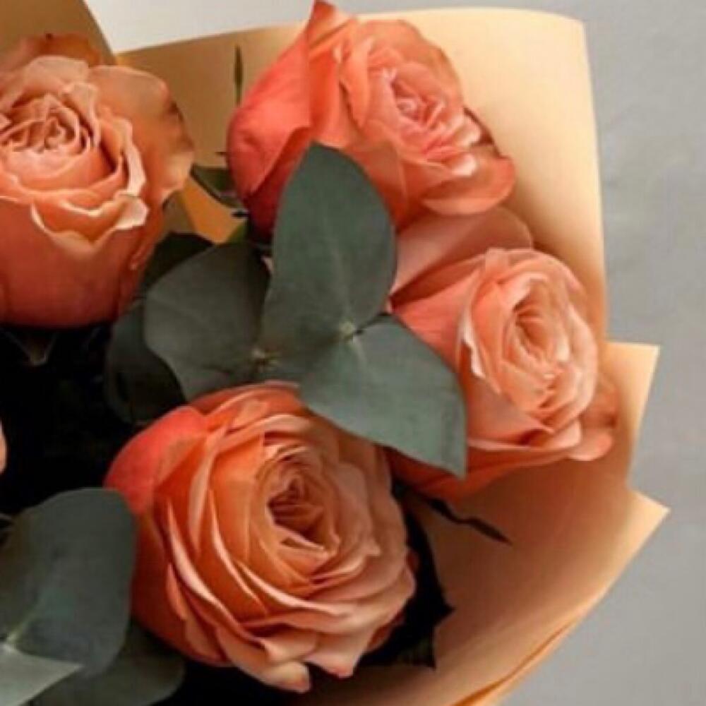 Эвкалипт – 4 шт.Зелень – 4 шт.Лента атласная – 1 шт.Упаковка дизайнерская – 2 шт.Роза пионовидная кахала – 7 шт.
