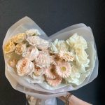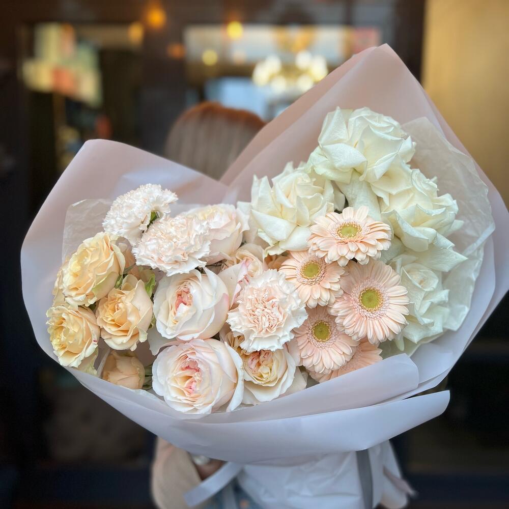 Одноголовая роза – 4 шт.Гербера – 5 шт.Диантус – 3 шт.Пионовидная роза – 5 шт.Кустовая роза – 1 шт.декоративная упаковка – 1 шт.Атласная лента – 1 шт.