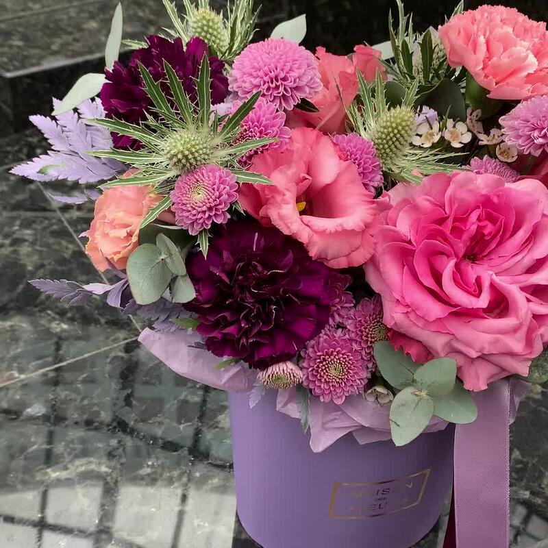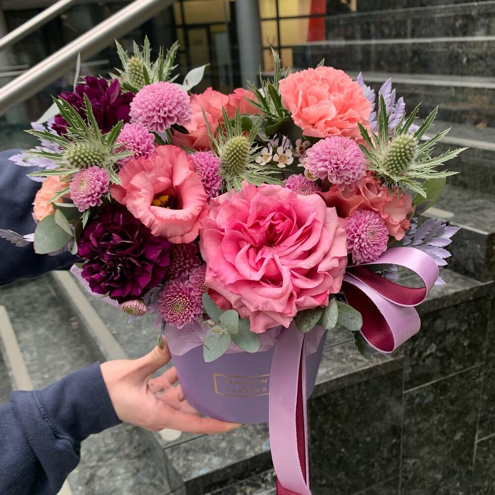 Букет цветов в фиолетовых, розовых и кремовых тонах