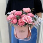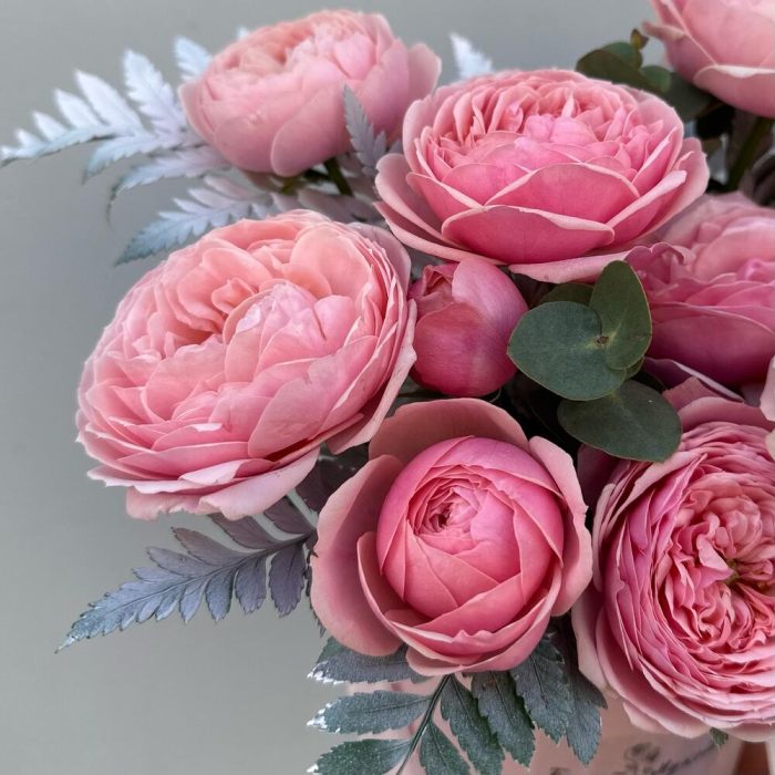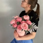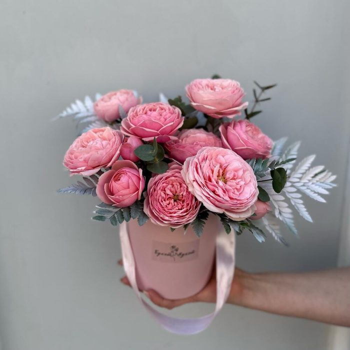 Эвкалипт – 1 шт.Коробка шляпная – 1 шт.Оазис флористический – 1 шт.Листья папоротника – 3 шт.роза кения пионовидная кустовая – 3 шт.