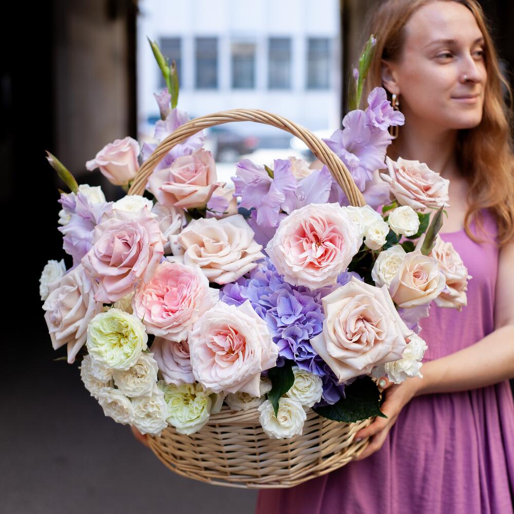 Роза пионовидная – 6 шт.Роза – 8 шт.Диантус – 9 шт.Гортензия – 1 шт.Гладиолус – 4 шт.Роза кустовая – 4 шт.Лизиантус – 3 шт.зелень микс – 3 шт.цветы микс – 4 шт.Корзина – 1 шт.