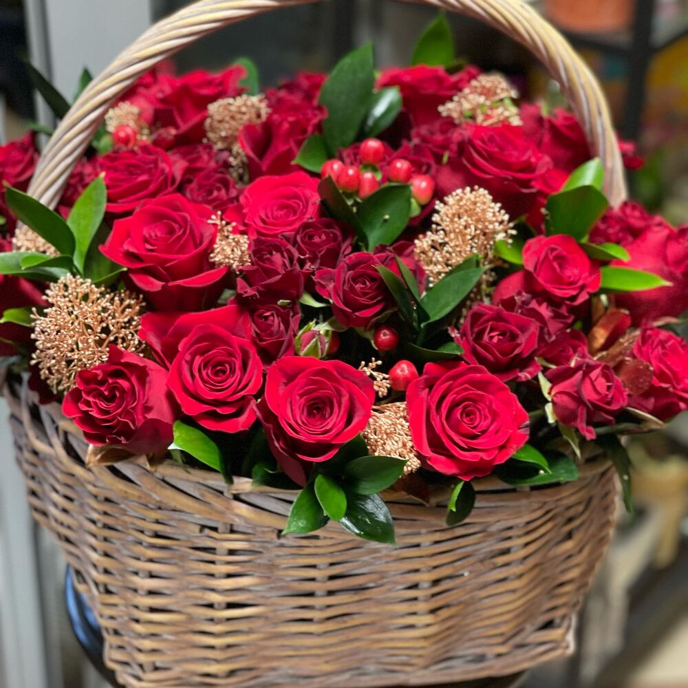 Роза Эквадор – 25 шт. Роза кустовая – 10 шт. Скиммия – 10 шт. Гиперикум красный КУСТОВОЙ – 5 шт. Писташ – 10 шт.