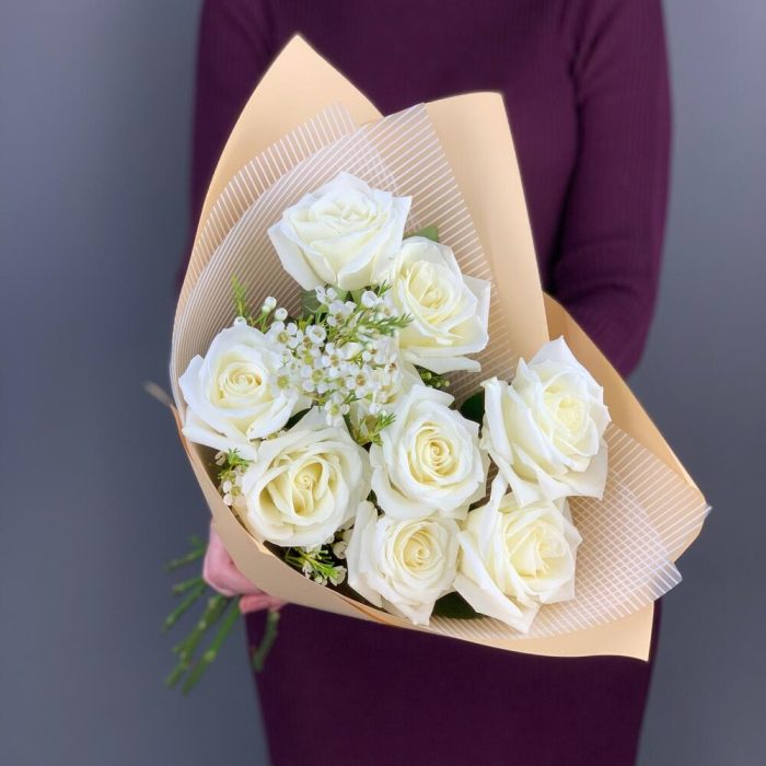 Роза белая – 9 шт.Ваксфлауэр – 1 шт.Упаковка дизайнерская – 1 шт.