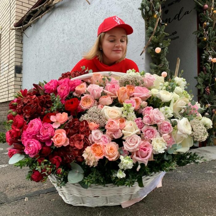 Корзина – 1 шт.Оазис – 6 шт.Гортензия – 3 шт.Кустовая пионовидная роза – 13 шт.кустовые розы – 15 шт.кустовые красные розы – 9 шт.Озотамнус – 5 шт.Лизиантус – 7 шт.Маттиола – 7 шт.Роза пионовидная – 9 шт.Роза Россия – 13 шт.Роза – 7 шт.Гвоздика – 17 шт.Зелень – 15 шт.