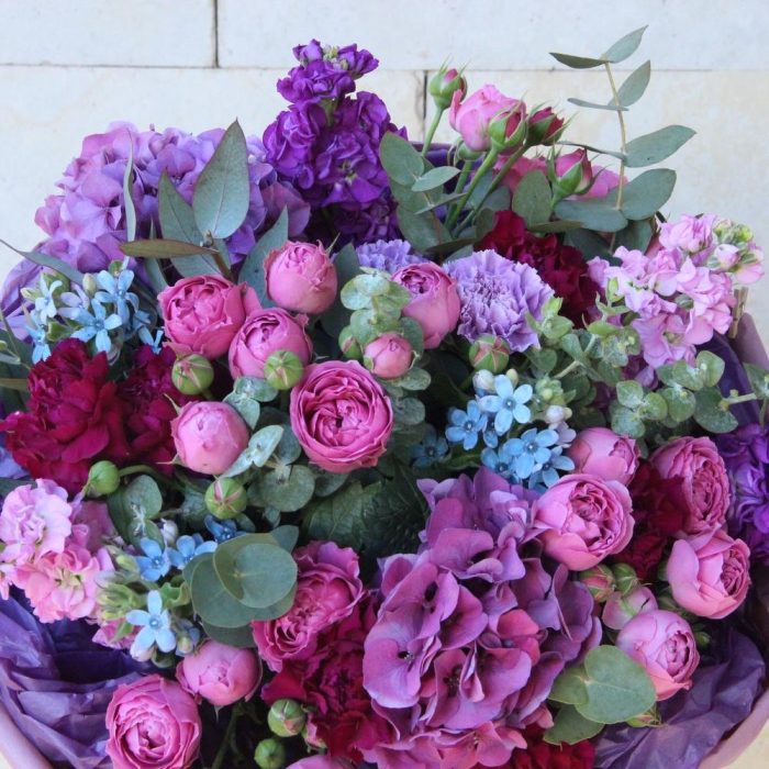 Твидия – 3 шт.Роза пионовидная кустовая – 5 шт.Маттиола – 8 шт.Диантус – 7 шт.Эвкалипт – 9 шт.Тишью – 3 шт.Гортензия – 1 шт.Упаковка – 1 шт.