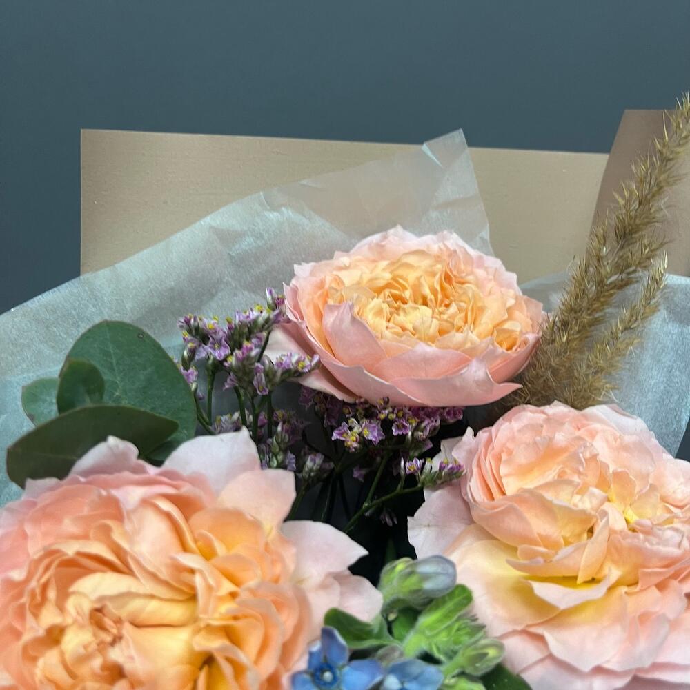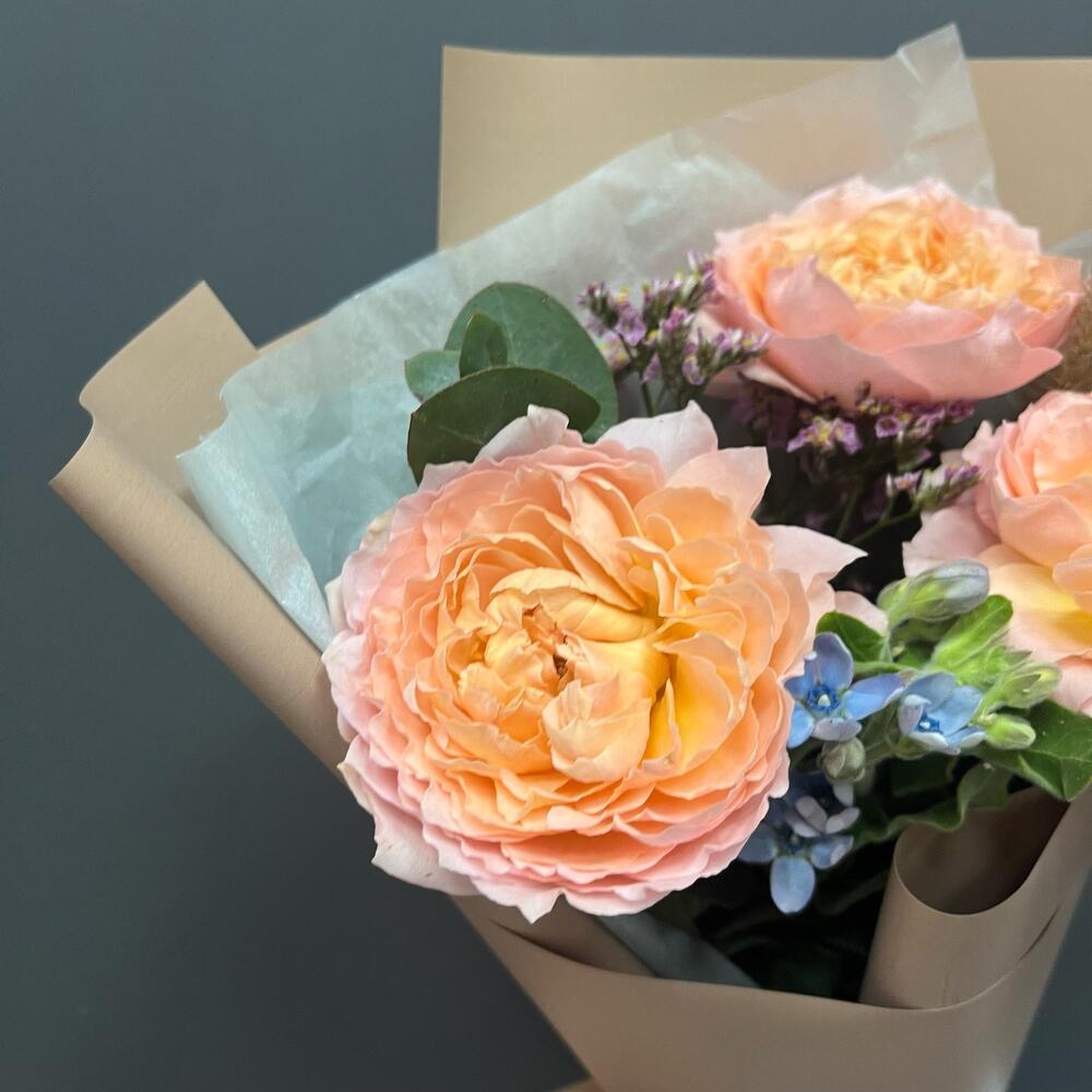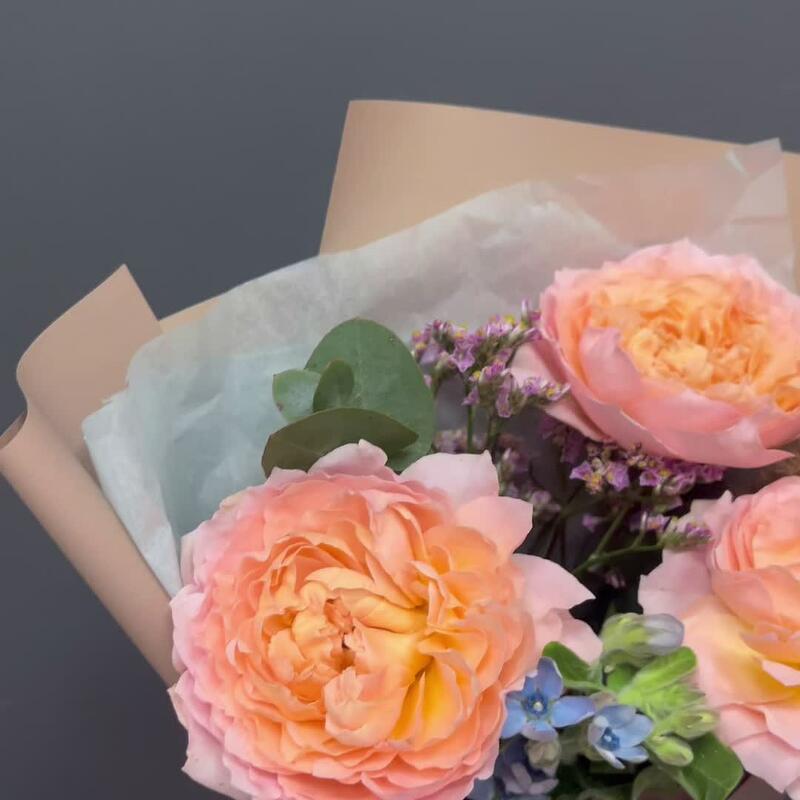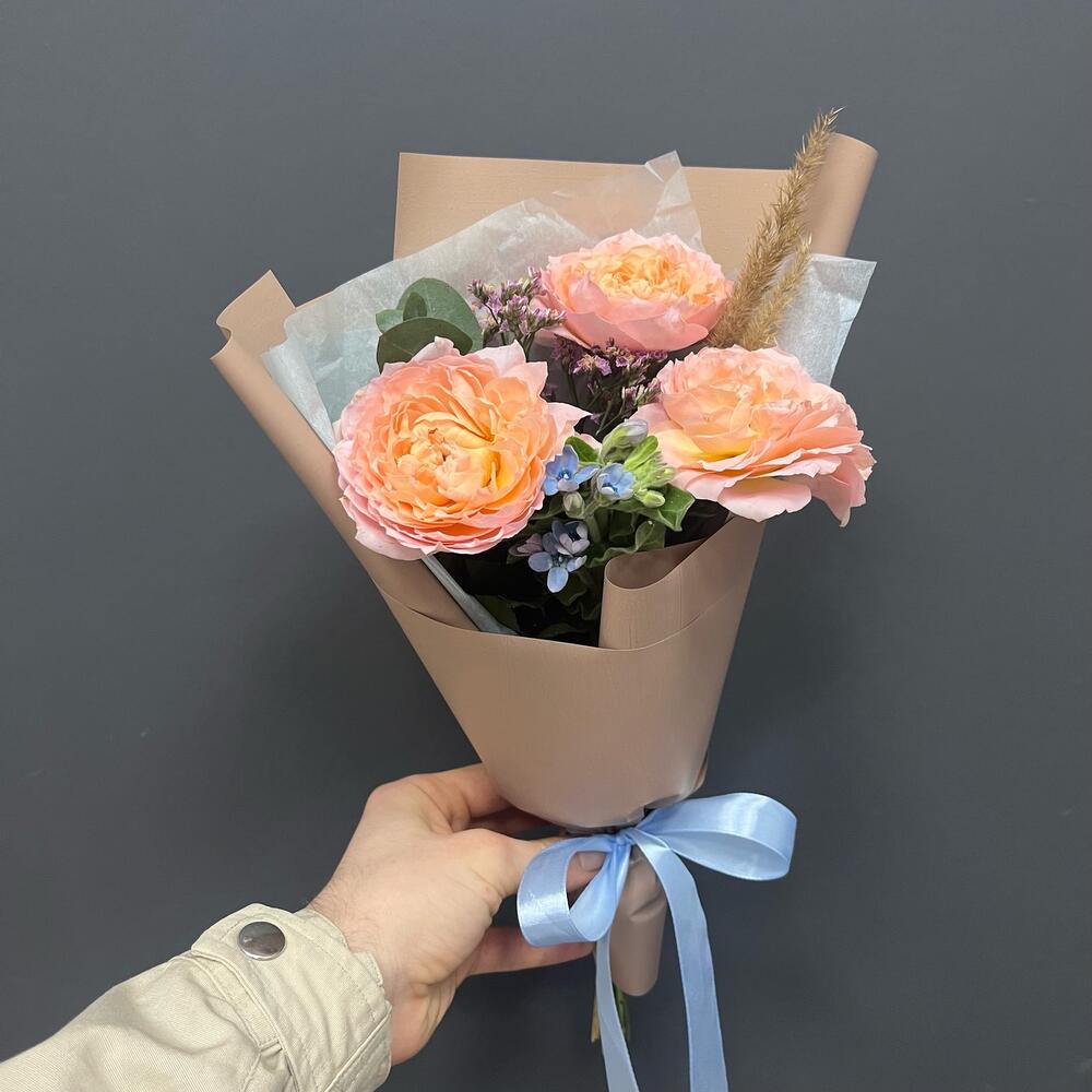 пионовидная премиум роза джульетта – 1 шт.твидия голубая – 1 шт.Тишью – 1 шт.Упаковка корейская пленка – 1 шт.Лента атласная – 1 шт.