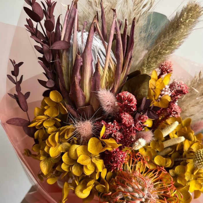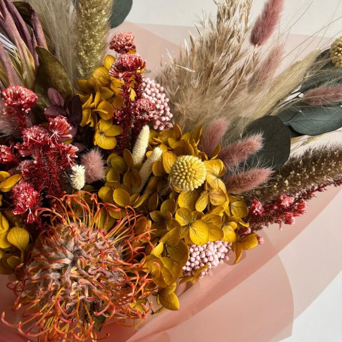 Гортензия – 1 шт.Озотамнус – 1 шт.Протея – 1 шт.Эвкалипт – 3 шт.Нутан – 1 шт.Капс – 1 шт.Упаковка дизайнерская – 1 шт.Ковыль – 2 шт.Лагурус – 9 шт.Сетария – 2 шт.Флум – 9 шт.пампас – 1 шт.