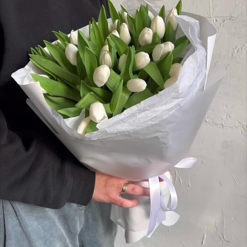 Лента атласная – 3 шт.Упаковка дизайнерская – 5 шт.Белый тюльпан – 29 шт.