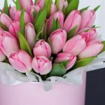 Нежно розовый тюльпаны в шляпной коробке , идеальное решение для подарка . Ваза больше не нужна . Тюльпаны подпитываются от флористической губки и стоят очень долго . )